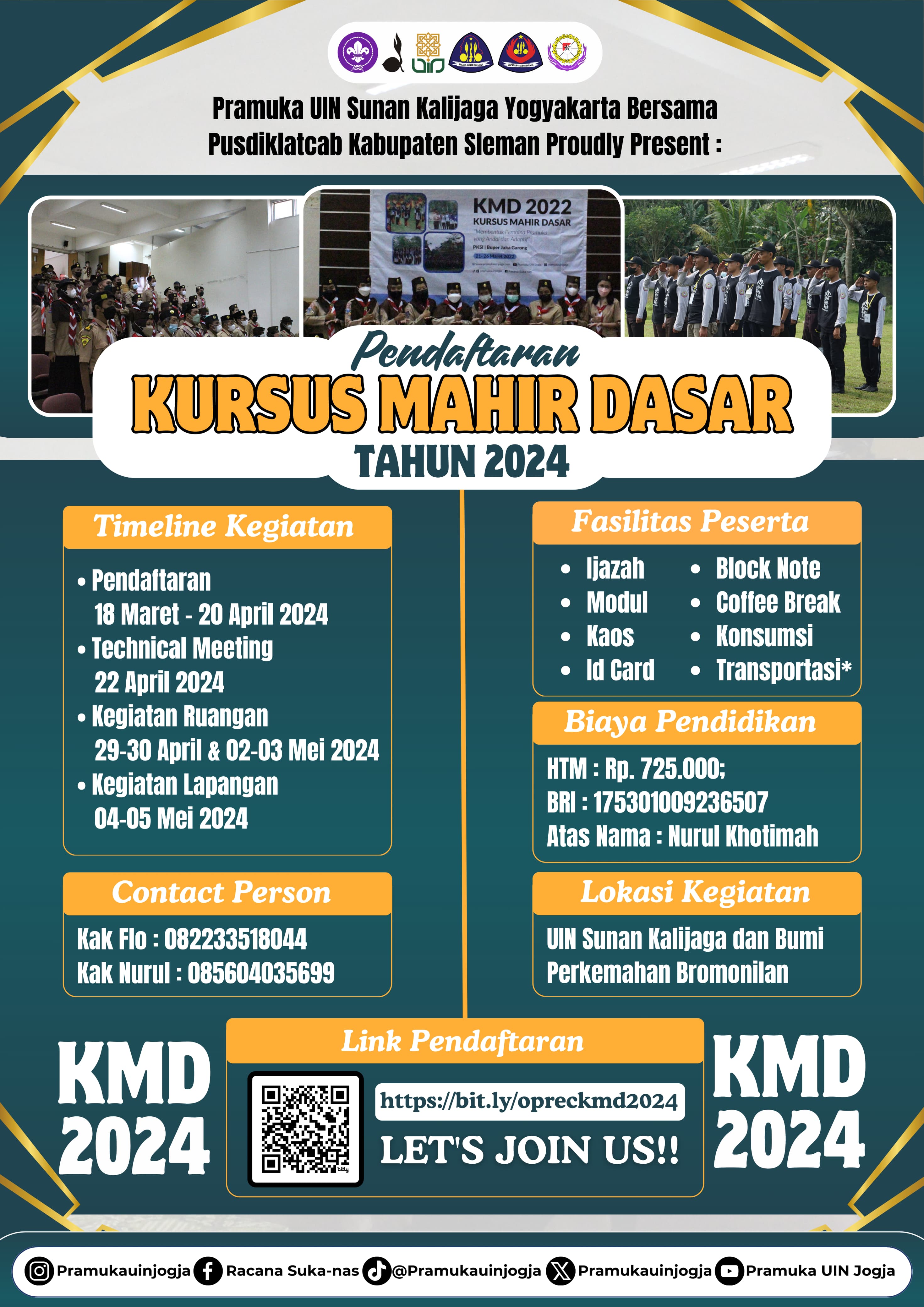 KMD 2024 Senin, 18 Maret 2024 14:13:34 WIB Dilihat : 551 Kali Hari:Senin s.d. Minggu Tanggal:29 April 2024 s.d. 5 Mei 2024 Jam:07:30:00 s.d. 17:00:00 WIB Tempat:UIN Sunan Kalijaga dan Bumi Perkemahan Bromonilan Deskripsi : Kursus Mahir Dasar 2034 Unduh